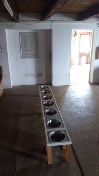 In dem Gebäude stehen mit Stroh gefüllte Hütten und eine gemeinschaftliche Box, welche ebenfalls mit Stroh ausgelegt ist.