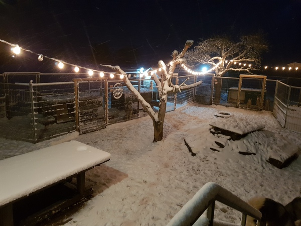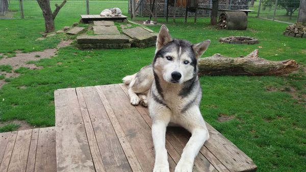 Im Zentrum des Geheges, gibt es einen Liegehügel, der meistens von Nanuk und Kena belagert wird. In der Nähe des Hügels, befindet sich ein Holzhaus auf Stelzen, mit drei verschiedenen Ebenen, das durch eine Holzrampe zugänglich ist. Auf einem großen Tisch aus Eichenholz und einem Deko-Hundeschlitten können es sich die Hunde zustätzlich bequem machen.